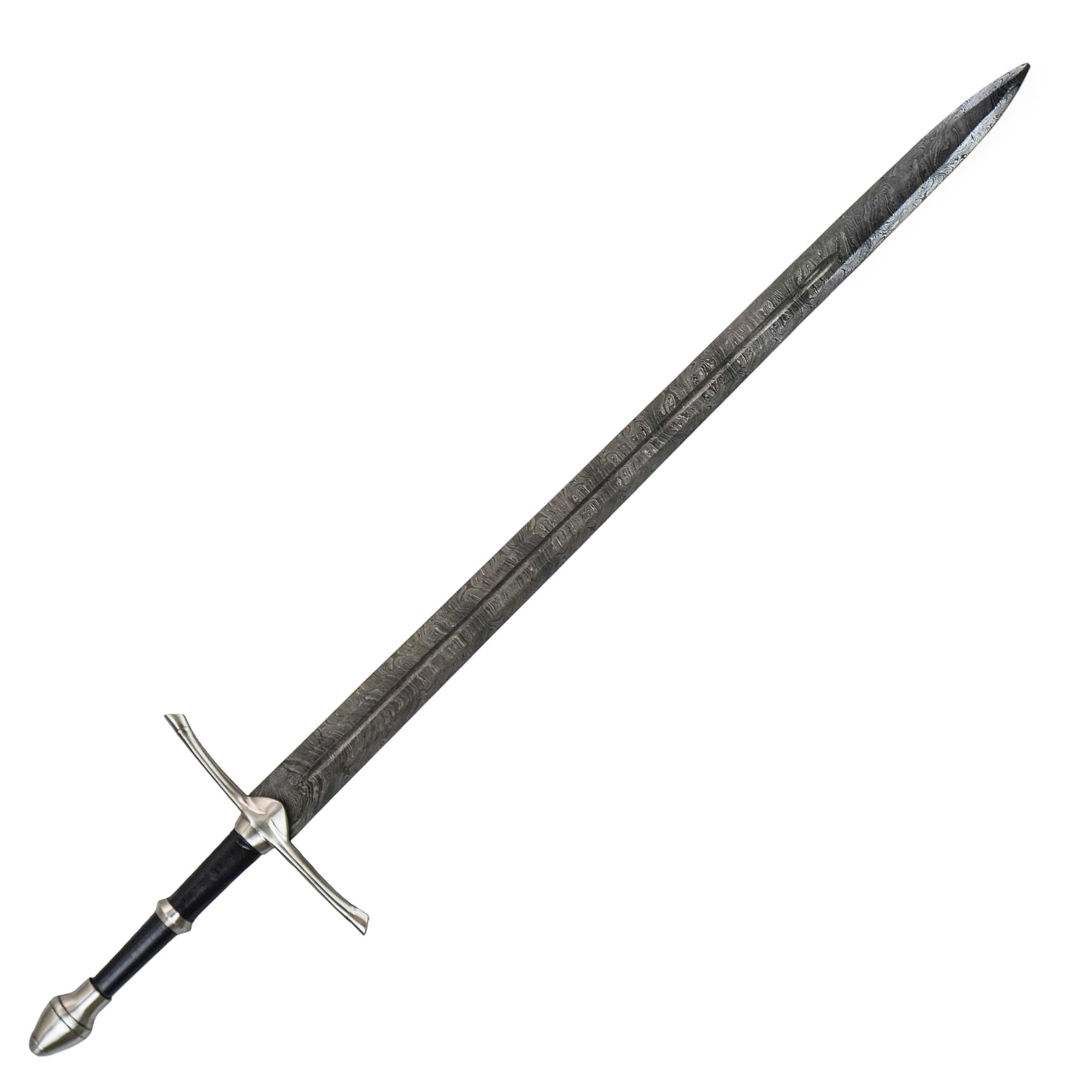 The beauty of history and artisanship converge in our Damascus steel longsword, featuring an additional knife. With an overall length of 44" and a 9" knife, this combination is a formidable addition to any enthusiast's collection.